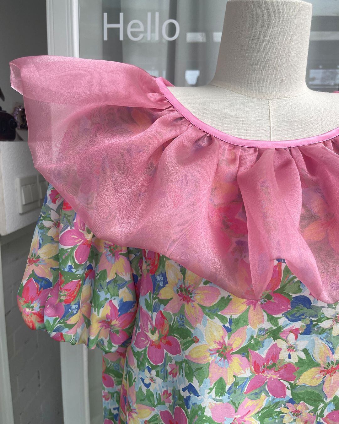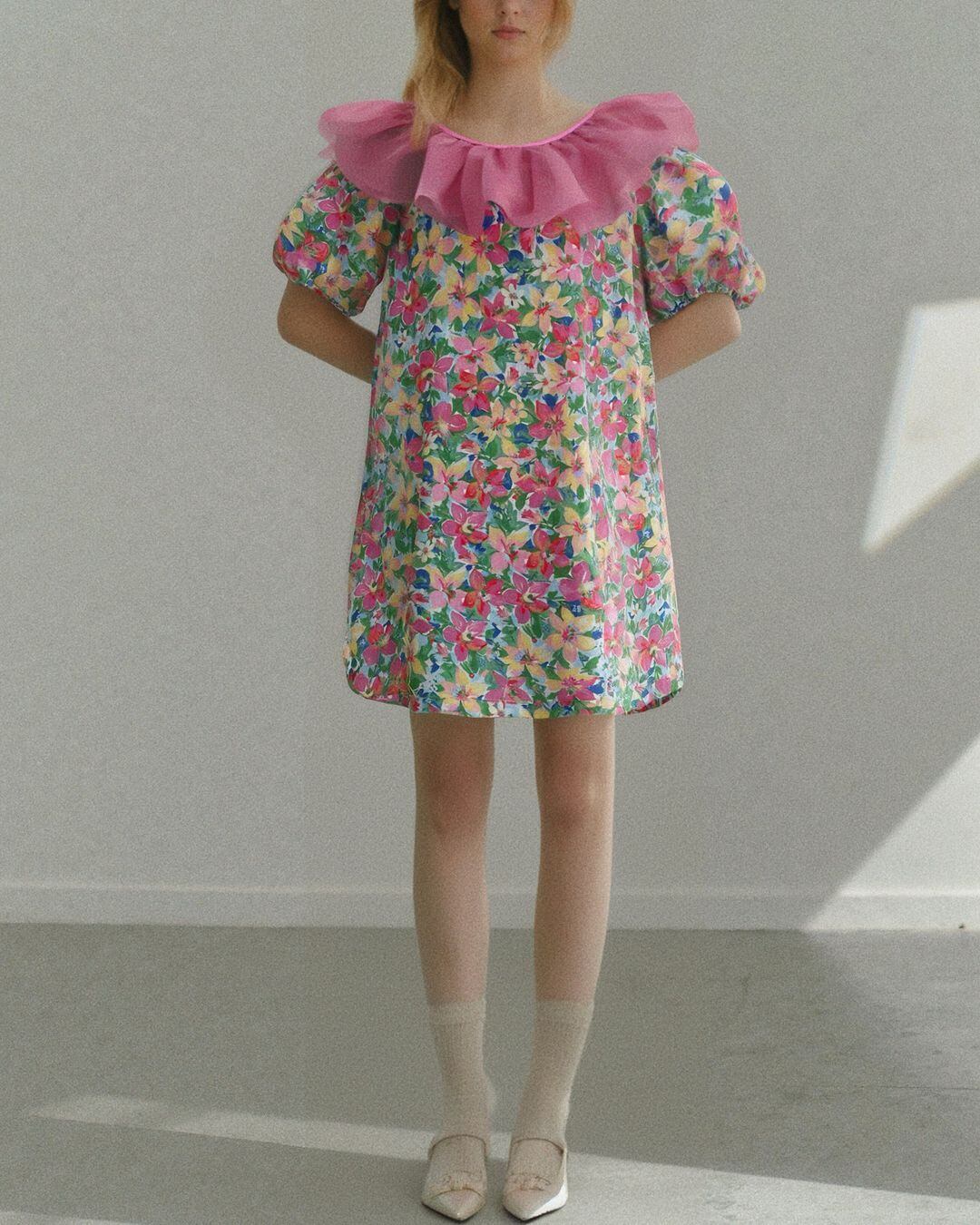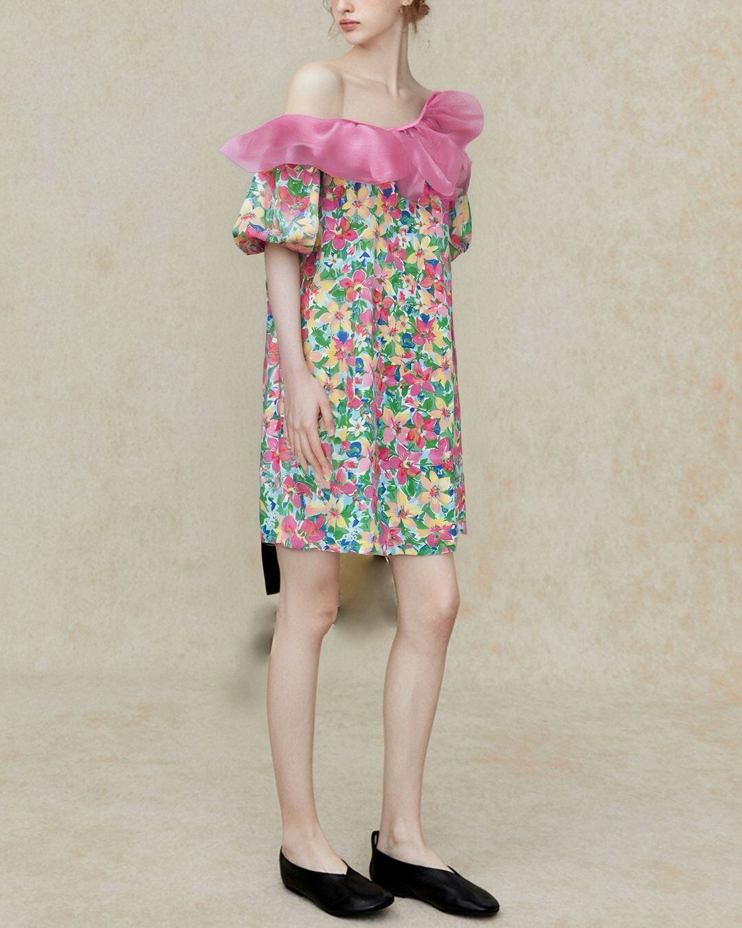 Frill Neck Puff Sleeve Floral One-piece V0269 as