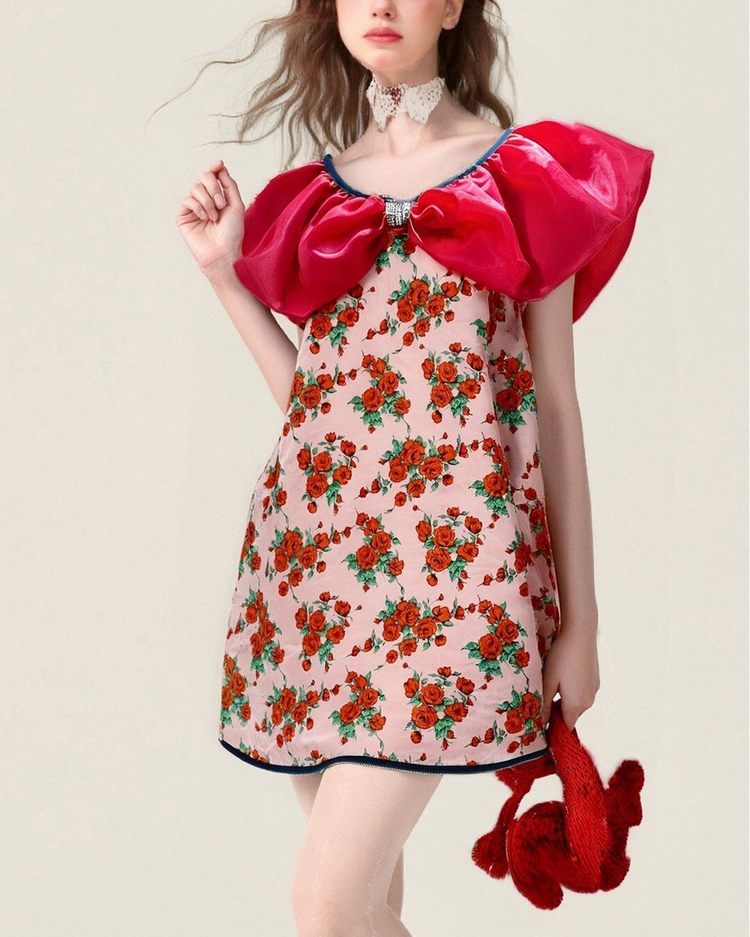 Contrast Puff Sleeve Floral One-piece V0275 as