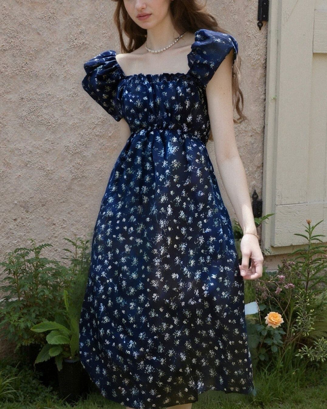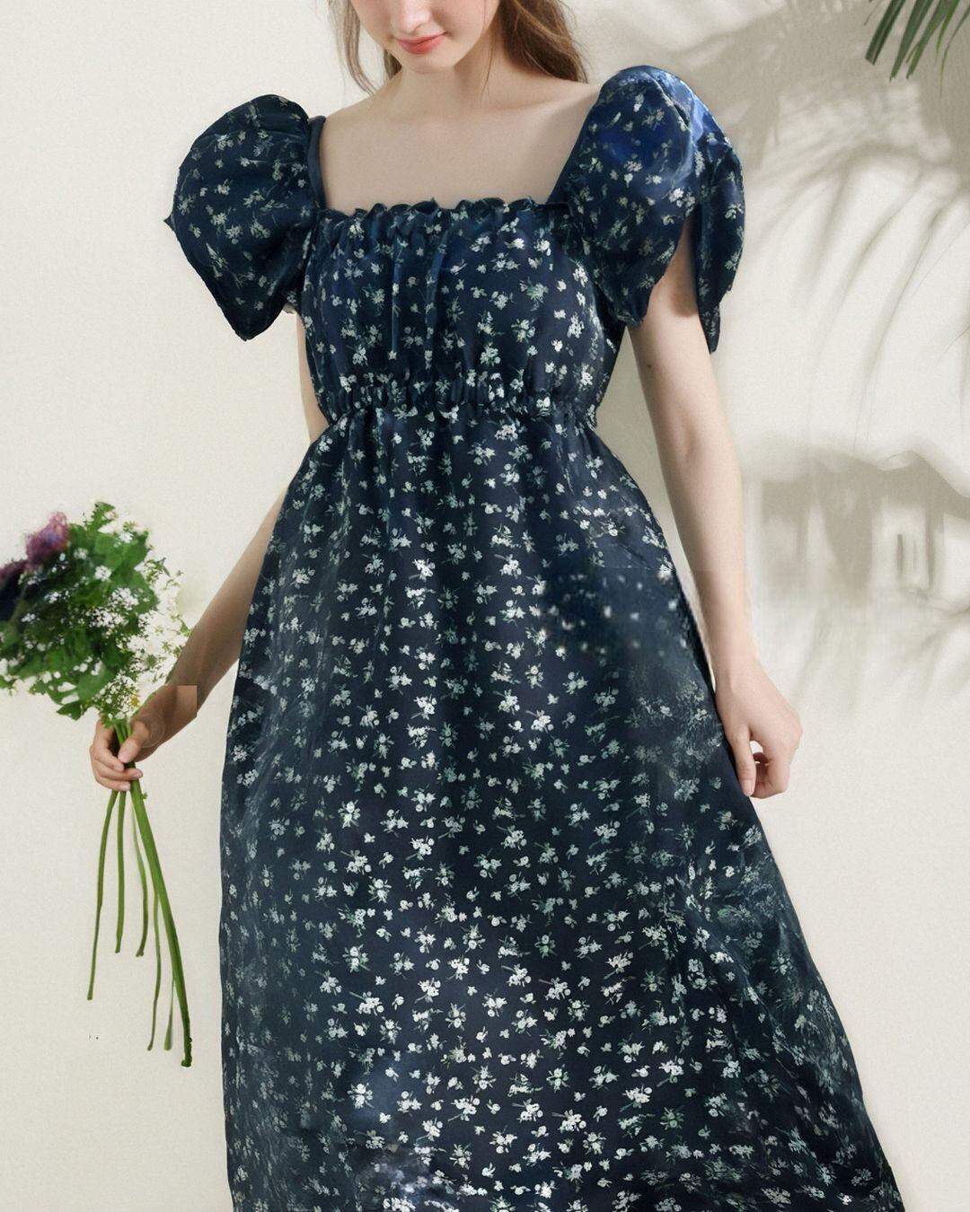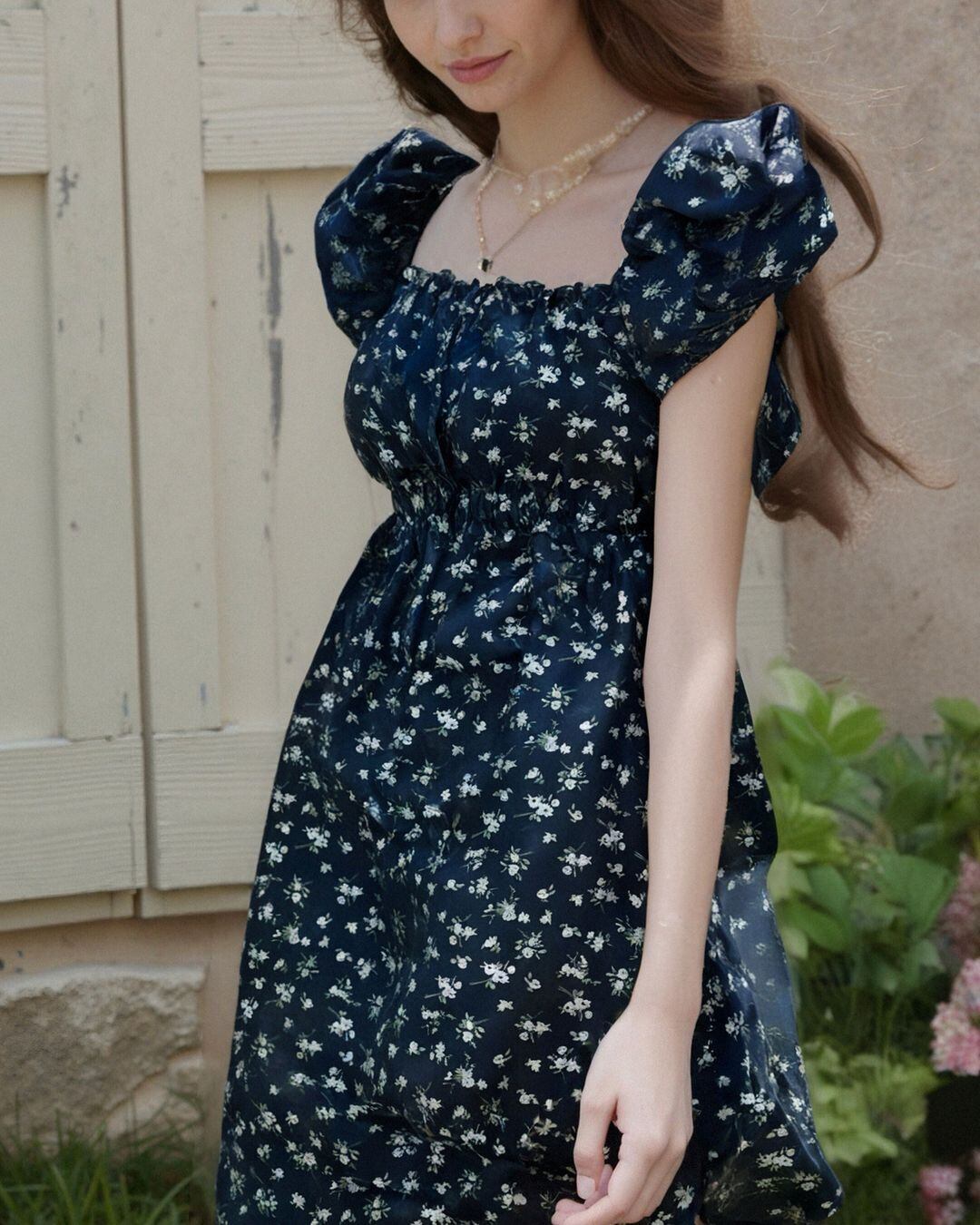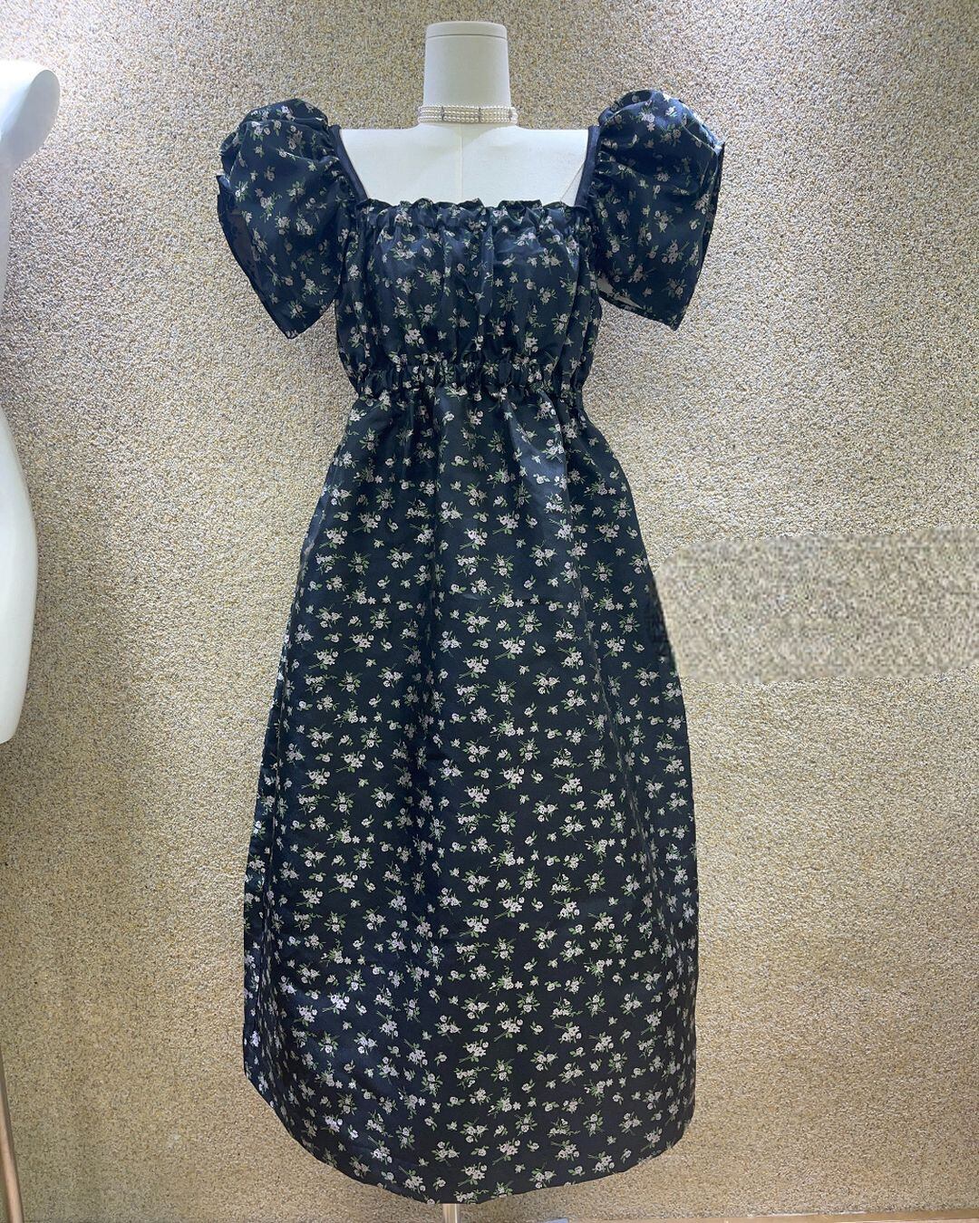 Puff-sleeve Floral One-piece V0328 as