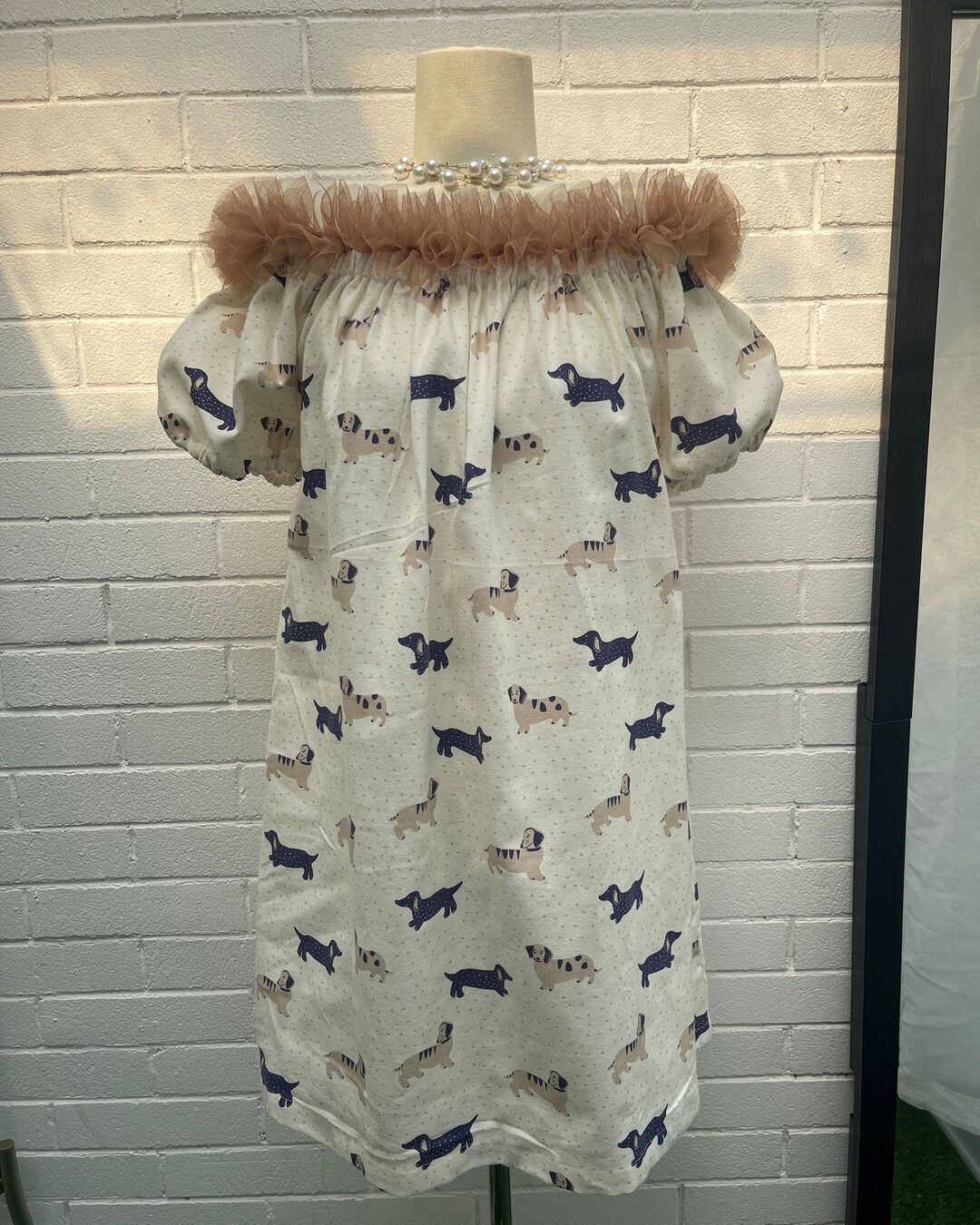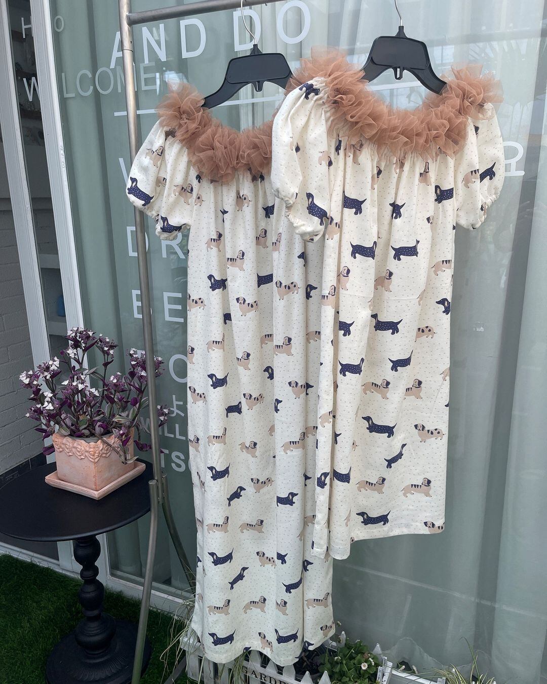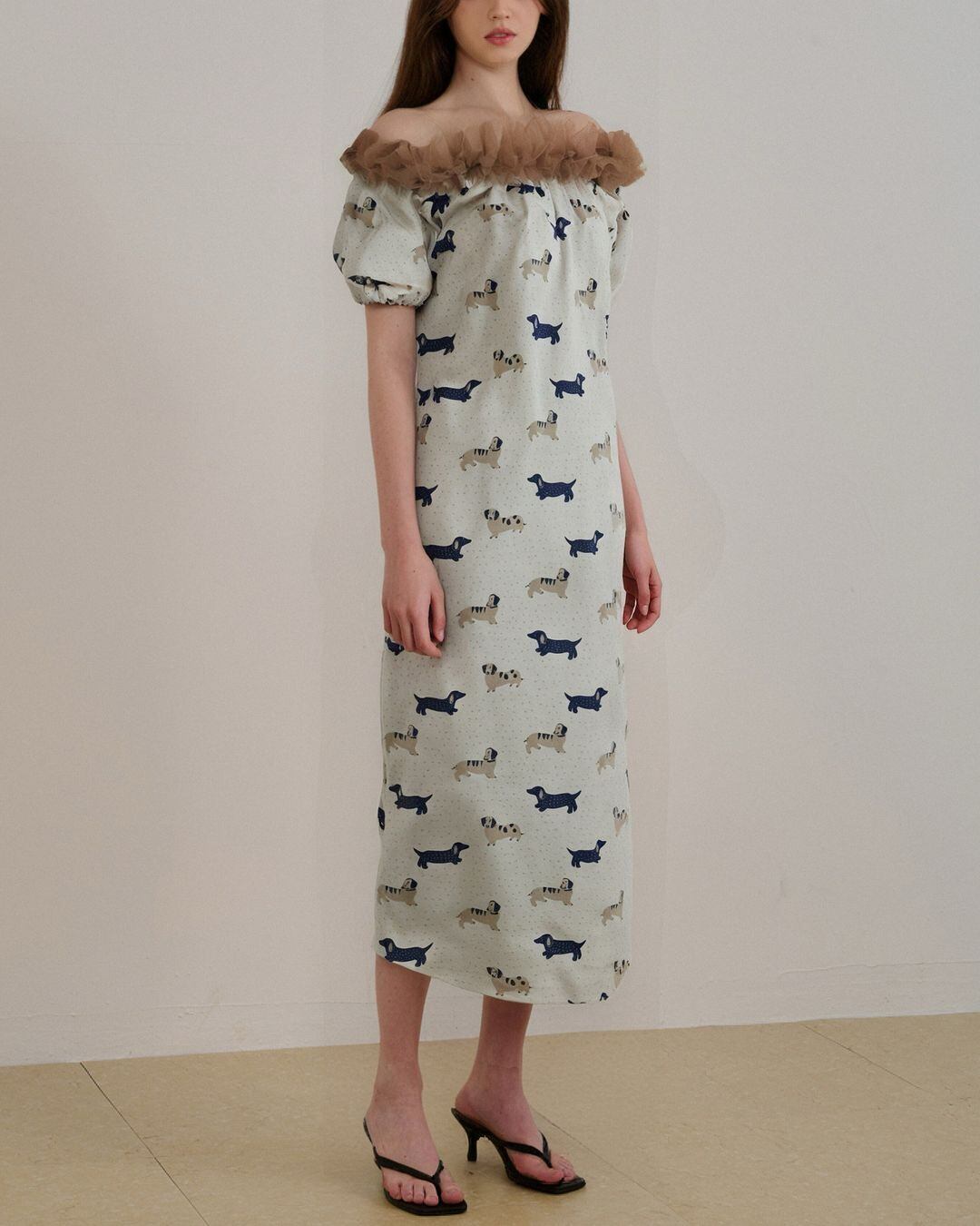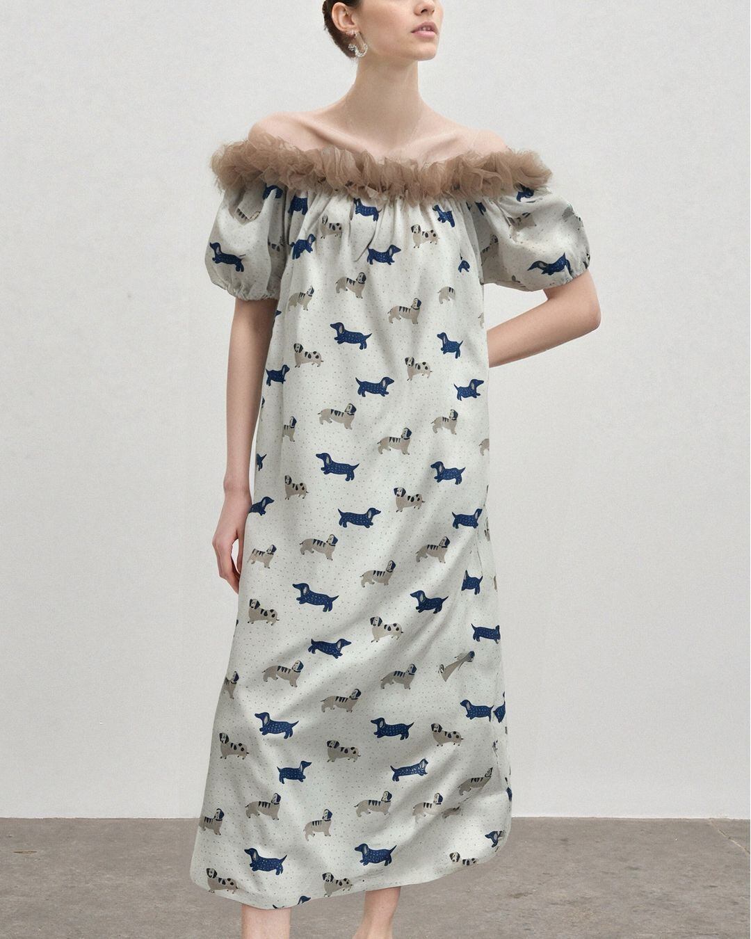 Mesh Frill Dog Print Off-shoulder One-piece V0356 as