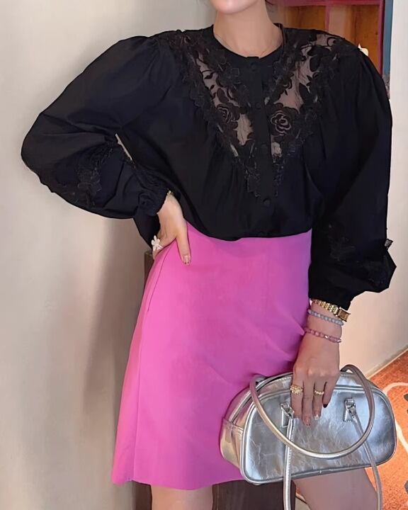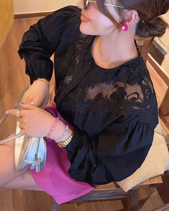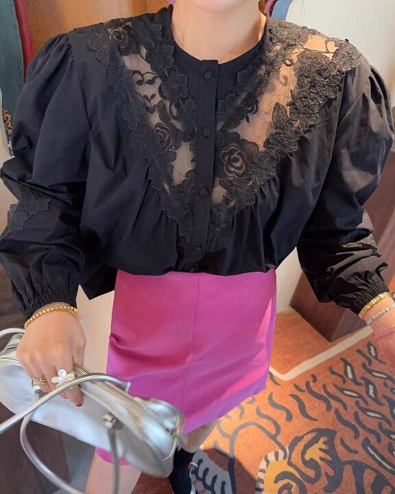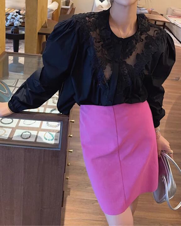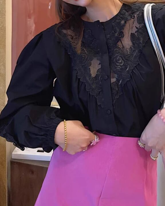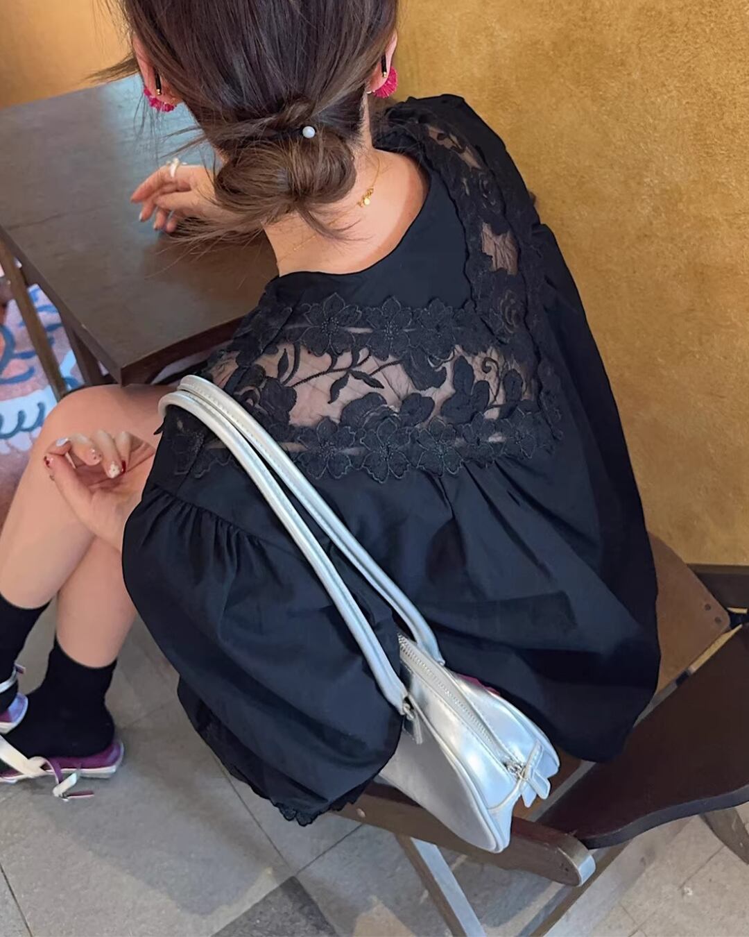 Lace Panelled Puff Sleeve Blouse V0379 sh