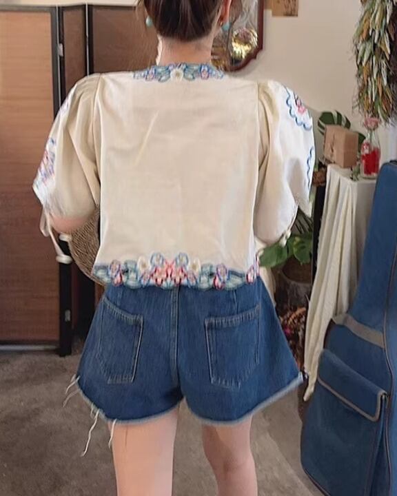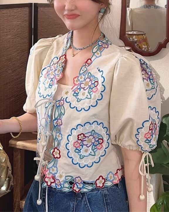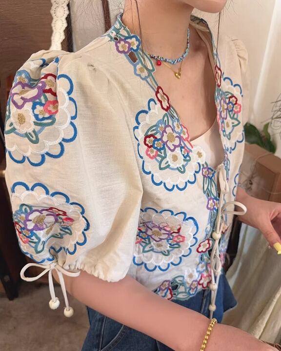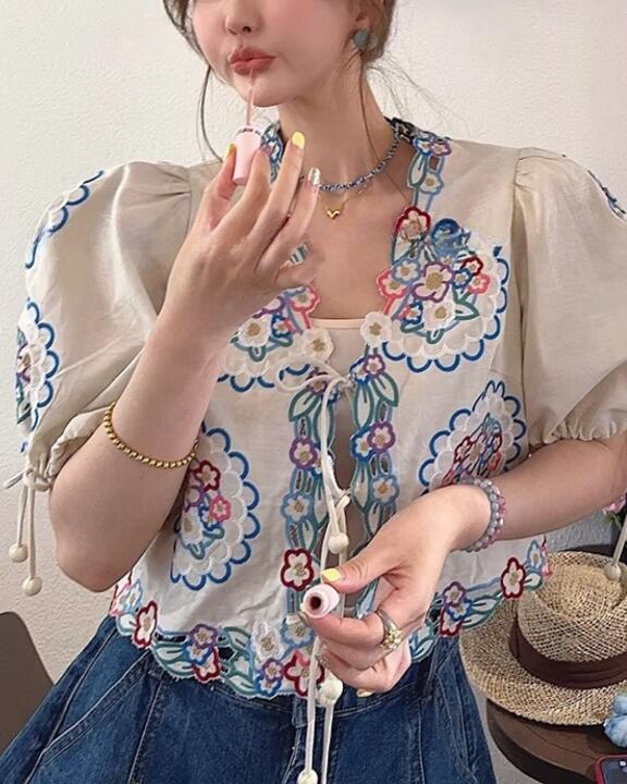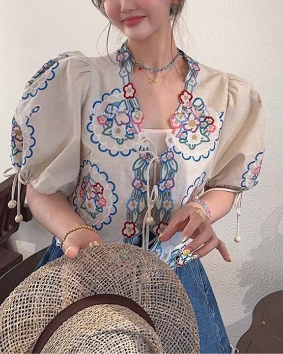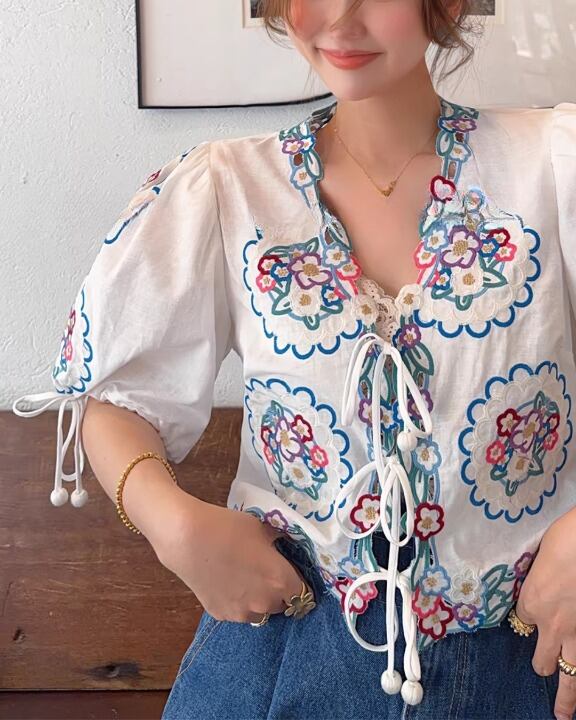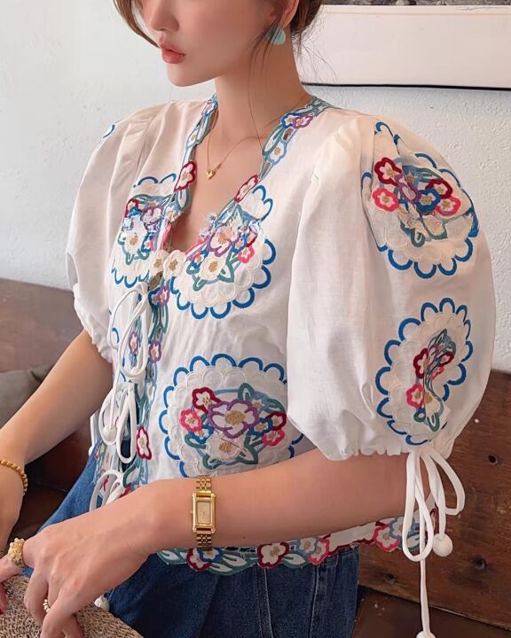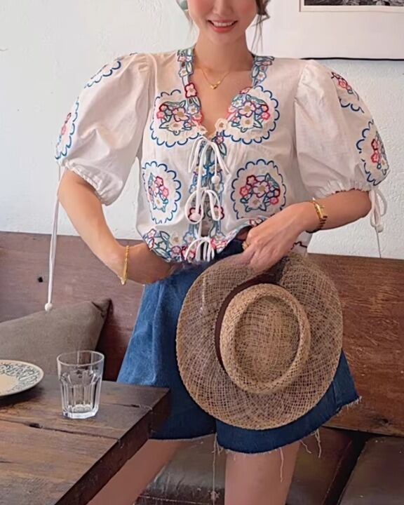 Floral Embroidery Puff Sleeve Tie-Front Blouse V0380 sh