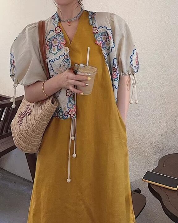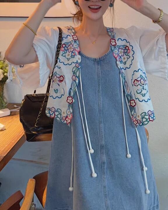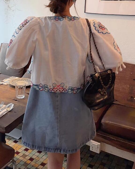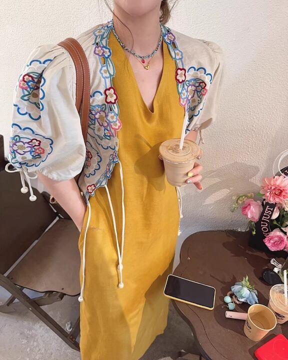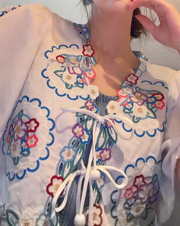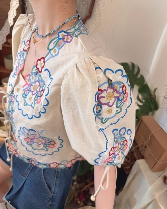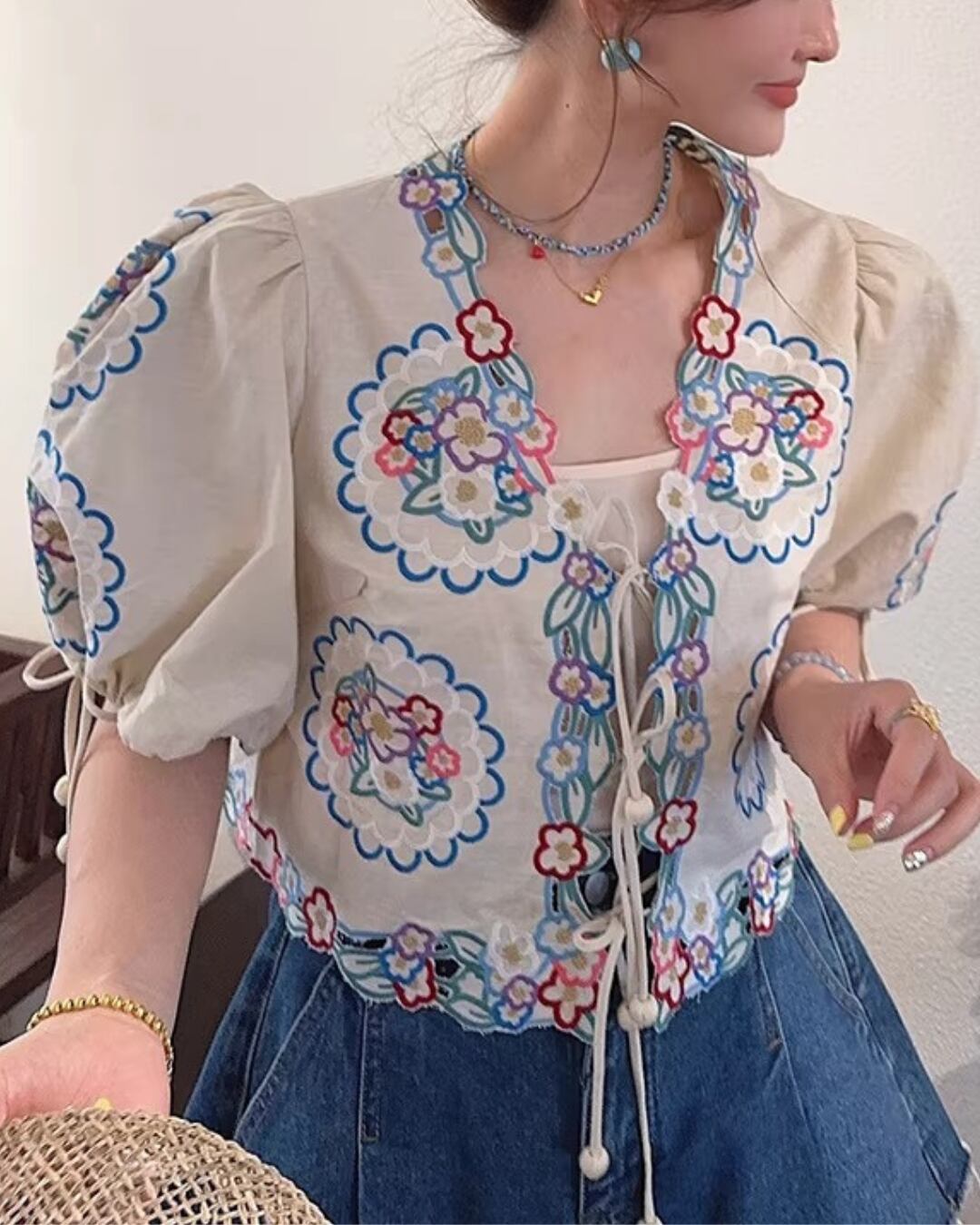 Floral Embroidery Puff Sleeve Tie-Front Blouse V0380 sh