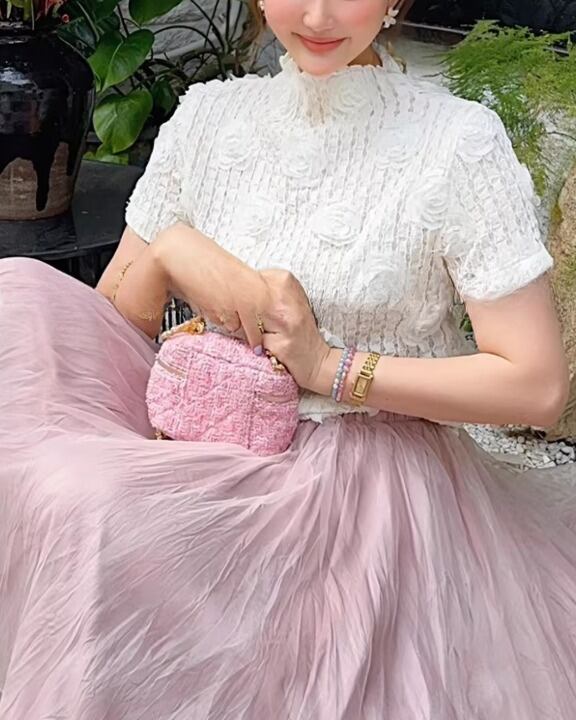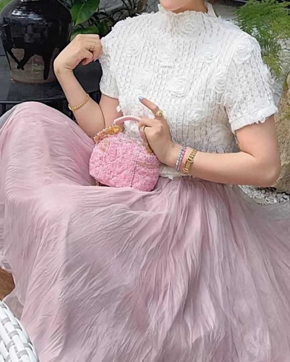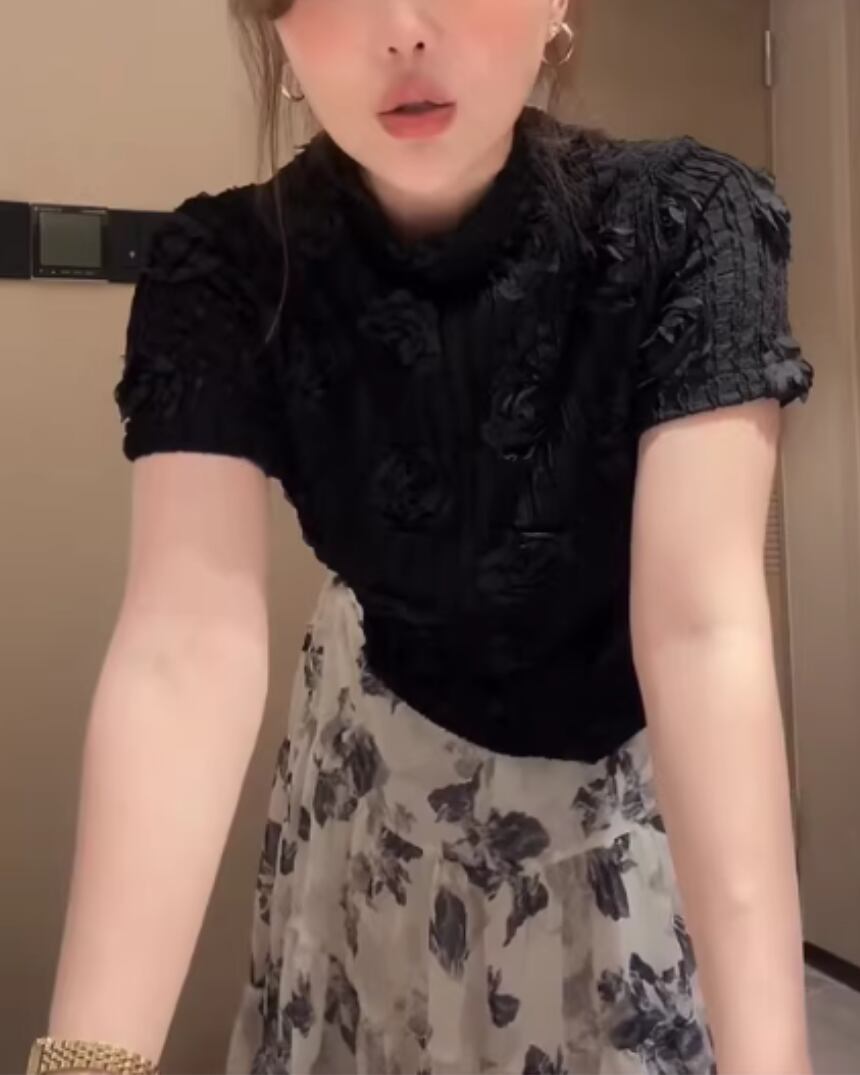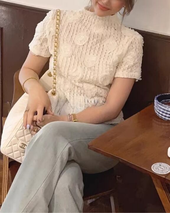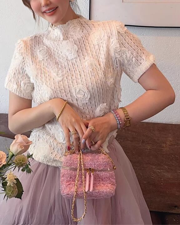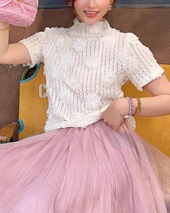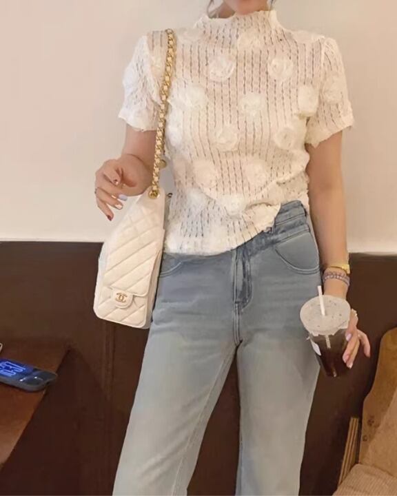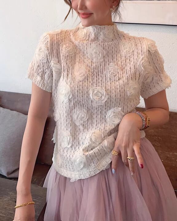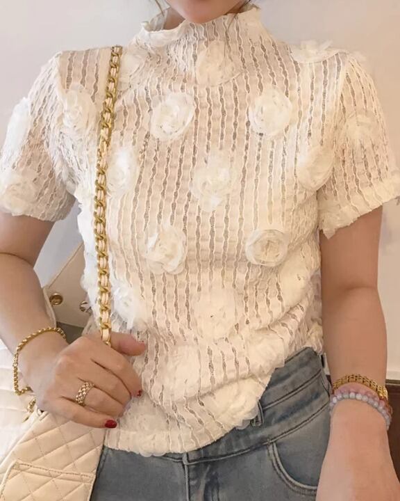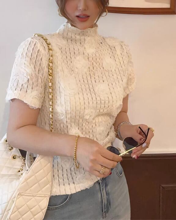 Embossed Flower Sheer High-Neck Top V0381 sh