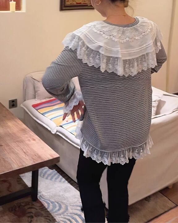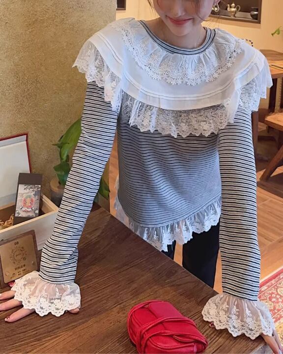 Romantic Lace Striped Long Sleeve Tee V0383 sh