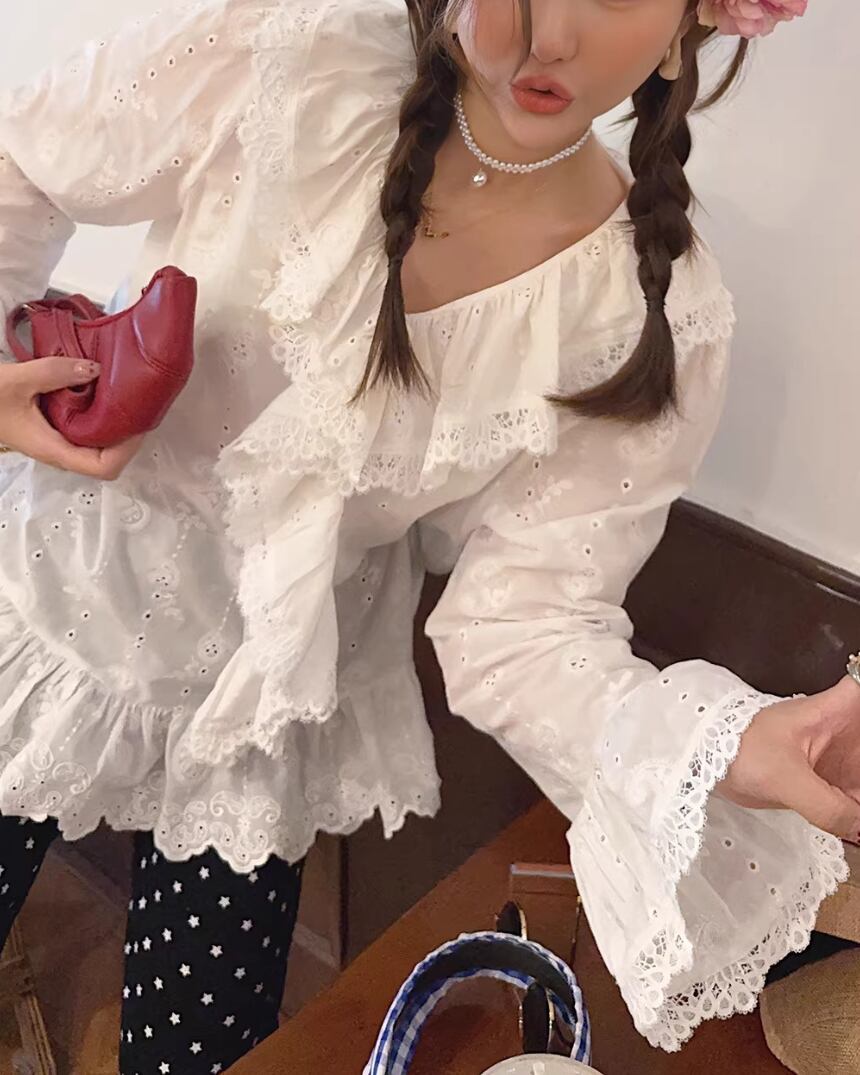Lace-Trimmed Ruffle V-Neck Blouse V0388 sh