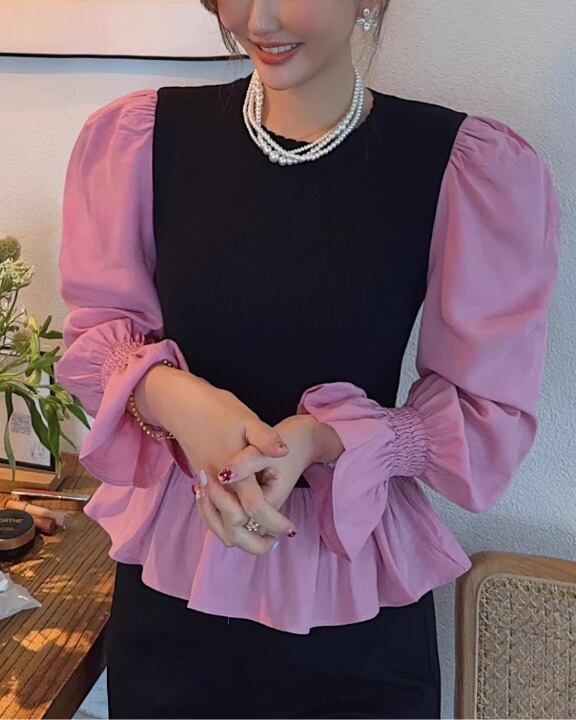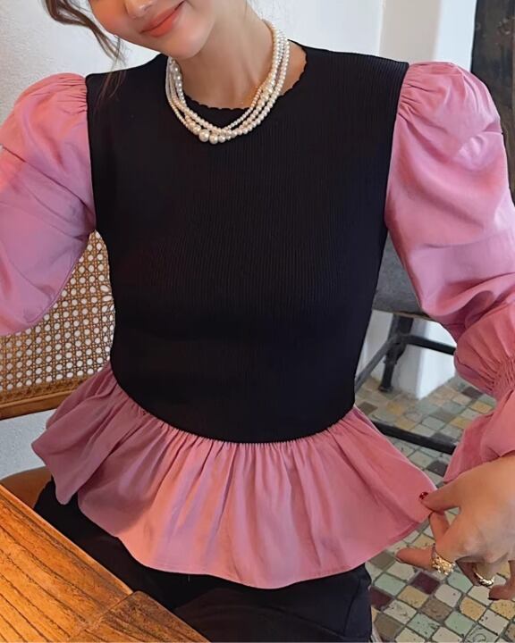 Volume Sleeve Knit Docking Peplum Blouse V0389 sh