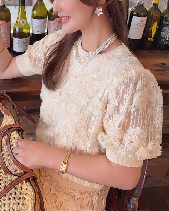 3D Rose Lace Puff Sleeve Knit Pullover V0392 sh