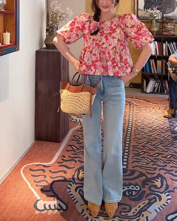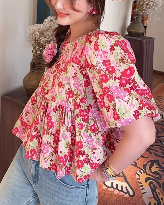 Floral Print Puff Sleeve Peplum Blouse V0398 sh