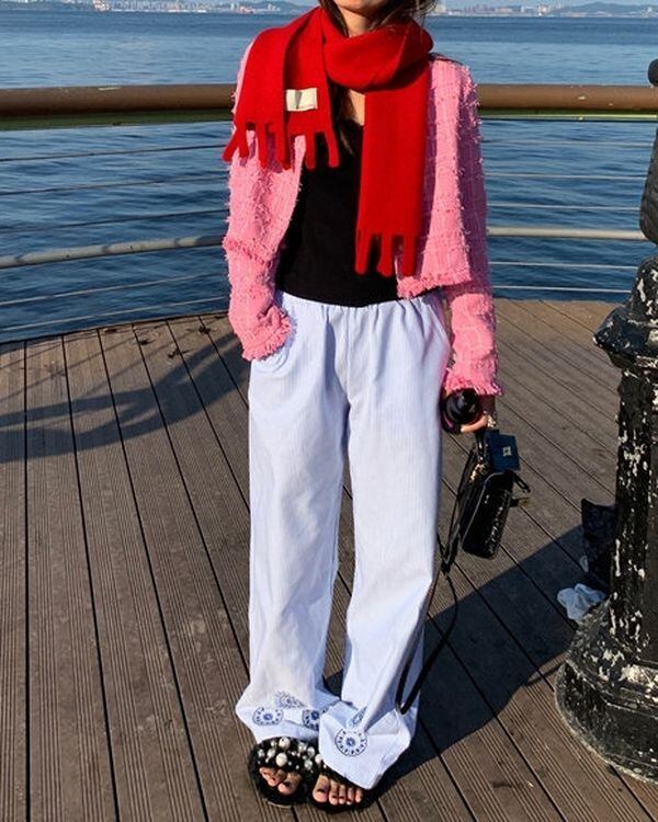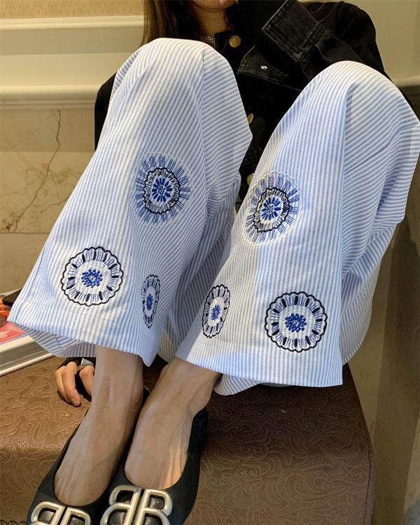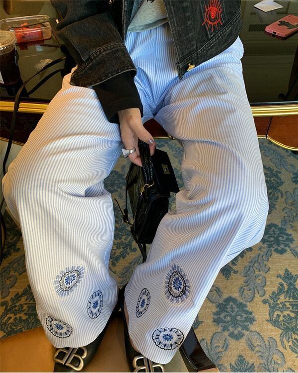 Embroidered Hem Stripe Pants V0534 ju
