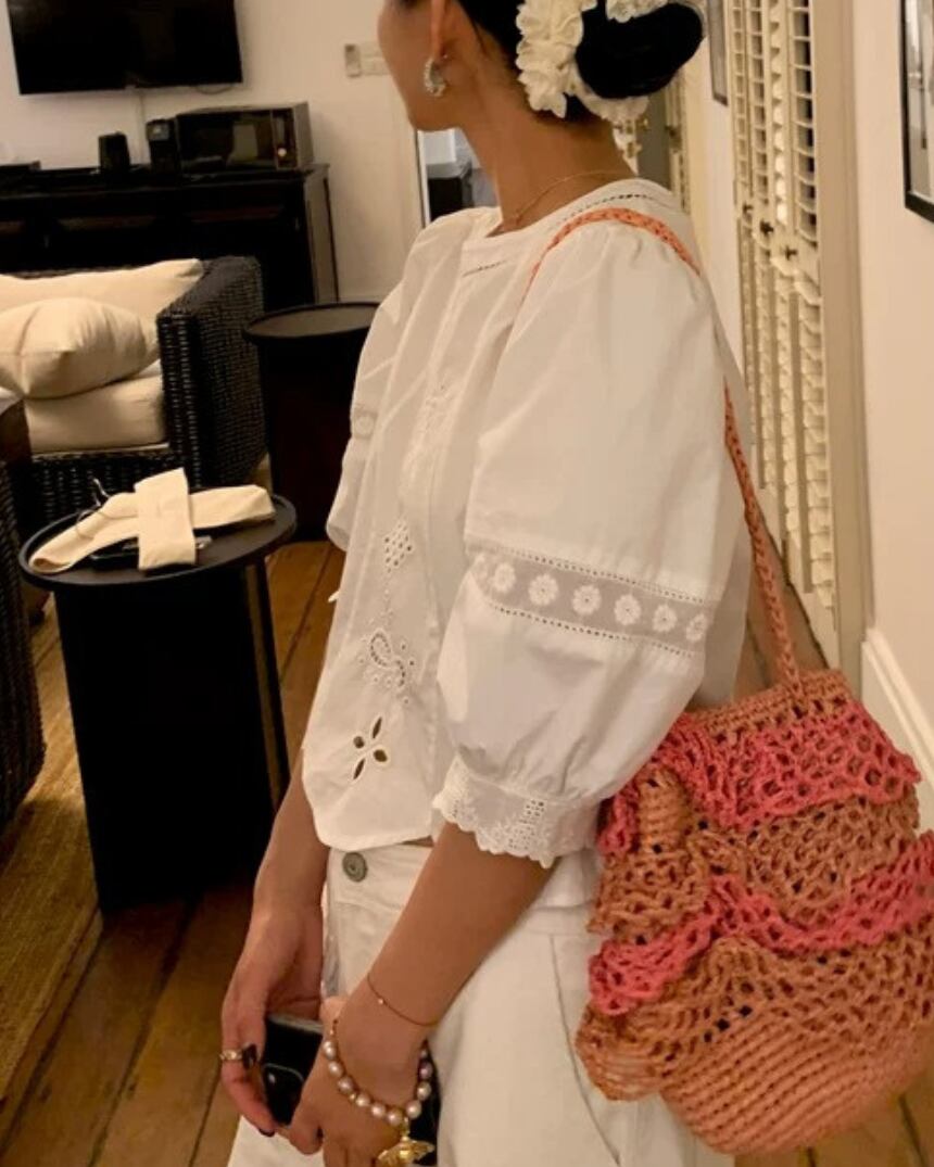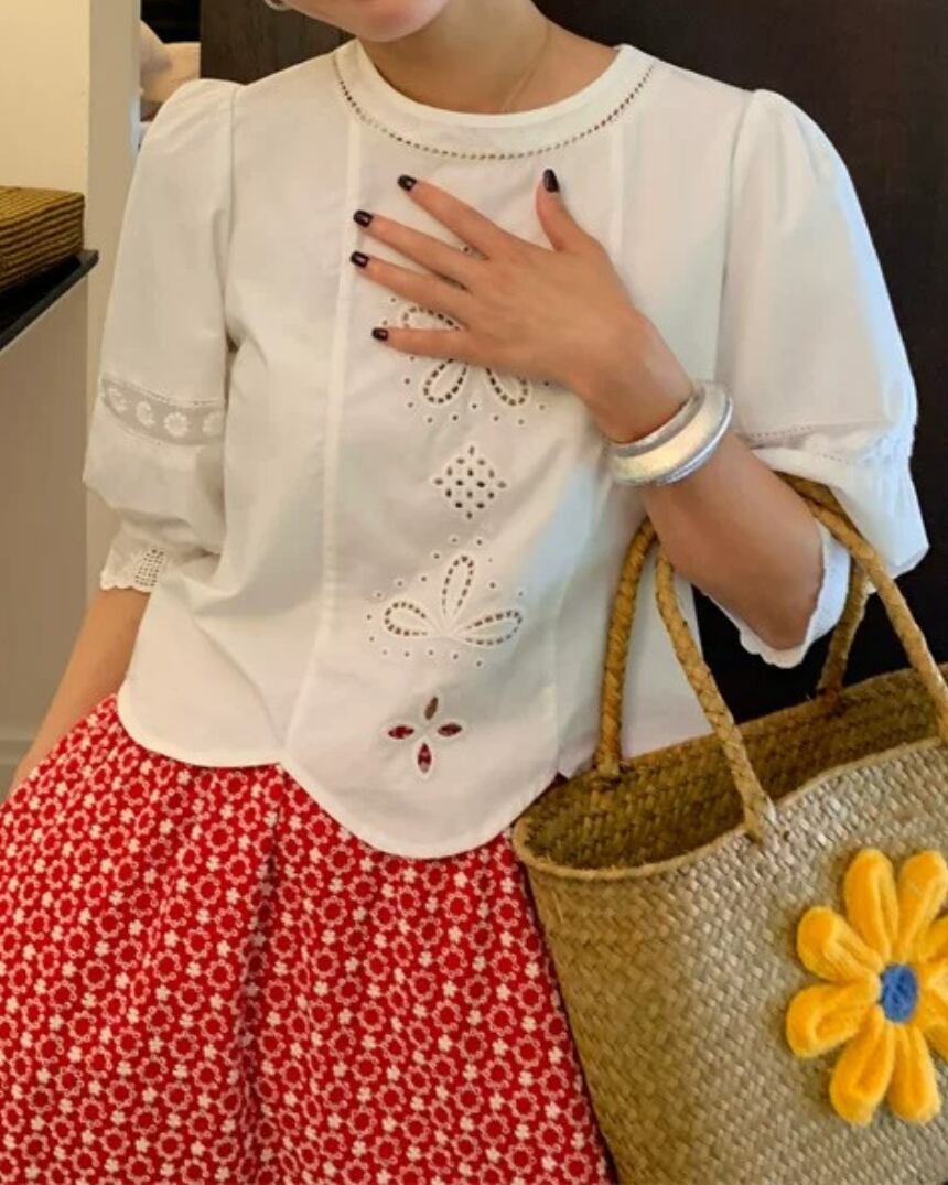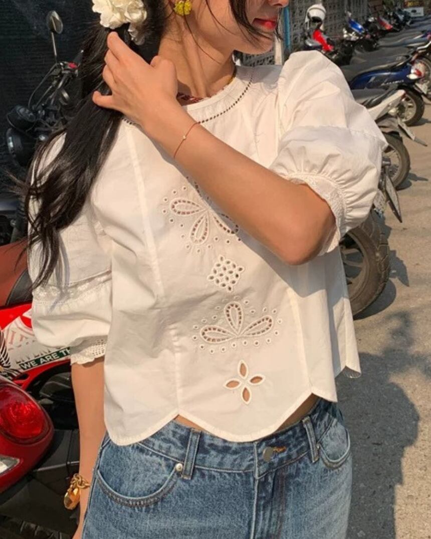 Scalloped Embroidered Gathered Puff Sleeve Blouse V0544 ju