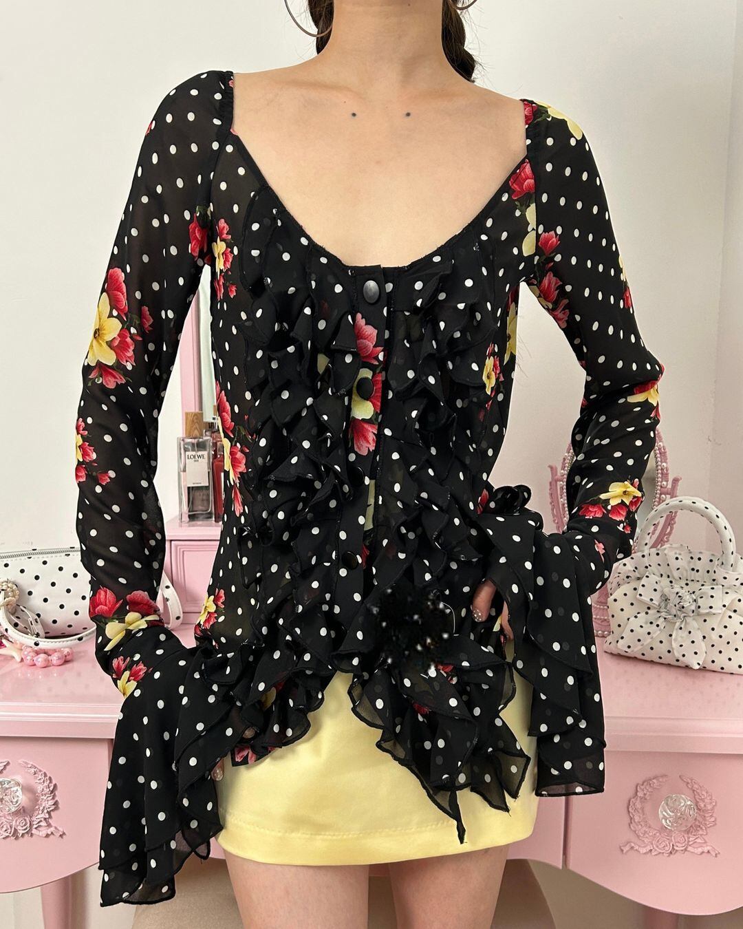 Dot & Fruit Print Frill Blouse V0565 be